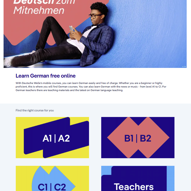 Proficiency in German will eventually be required. But, no worries, everyone can learn it. Even free of charge. With Deutsche Welle's mobile courses, you can learn German easily and free of charge. Whether you are a beginner or highly proficient, this is where you will find German courses. You can also learn German with the news or music - from level A1 to C1. For German teachers there are teaching materials and the latest on German language teaching. Choose your language and .. go!